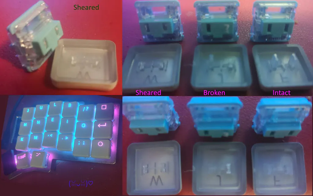When I was first installing them I broke a stem trying to remove one, and I thought that was the end of that. Unfortunately, I later broke my W key while playing a game, it just sheared off the stems. I'd done this to a few laptop keys in the past, but those were on butterfly switches. I'm a bit worried about this being a problem in the future.